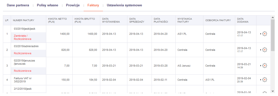 Przedostatnia zakładka zawiera listę faktur prowizyjnych danego Partnera
