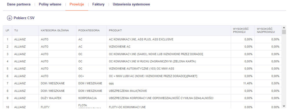 Klikając na kolejną zakładkę, Partner może sprawdzić jakie powinien otrzymać prowizje za poszczególne rodzaje produktów: