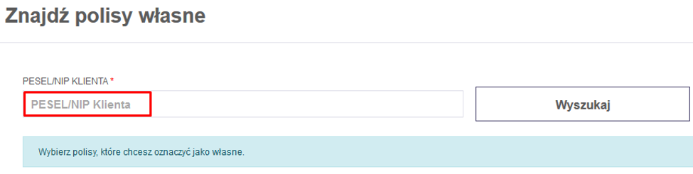 Aby odnaleźć właściwe polisy, niezbędne jest podanie dokładnego numeru PESEL/NIP i kliknięcie na przycisk WYSZUKAJ