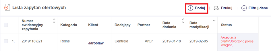 1.1. Aby dodać zapytanie ofertowe należy kliknąć „DODAJ” na liście zapytań ofertowych.