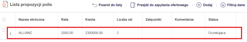 2.6. Zapisana propozycja polisy pojawi się na górze listy:
