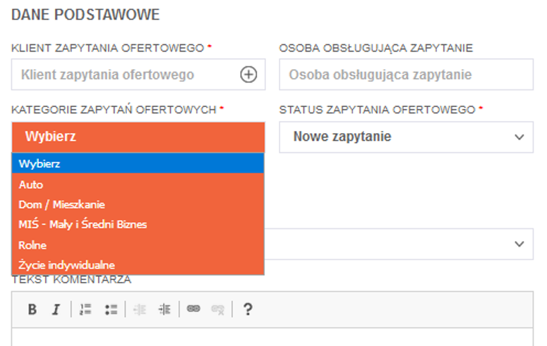 1.2.2. W kolejny kroku należy wskazać Partnera, do którego kierowane jest zapytanie – pozostawiamy puste, jeśli osoby obslugujące zapytania przydziela Centrala: