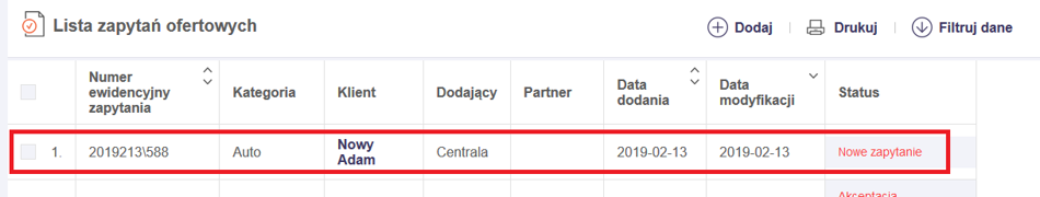 1.3. Zapisane zapytanie ofertowe pojawi się na górze listy ofertowej: