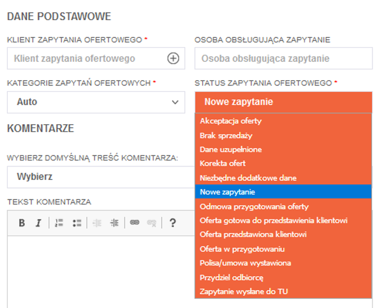 Status przy Nowym zapytaniu powinien być pozostawiony bez zmian jako Nowe zapytanie. Kolejne zmiany na zapytaniu (oferta w przygotowaniu, oferta przedstawiona klientów itp.) powinny iść w parze ze zmianą statusu.