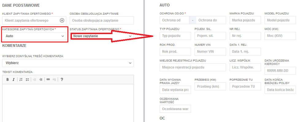 1.2.4. Po wskazaniu kategorii zapytania ofertowego po prawej stronie pojawia się okno z możliwością uzupełnienia danych szczegółowych: