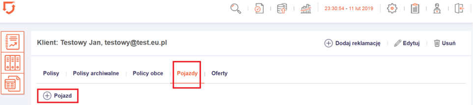 Formularz służący dodaniu nowego pojazdu można również otworzyć z poziomu kartoteki konkretnego Klienta, klikając na +Pojazd  w zakładce Pojazdy:
