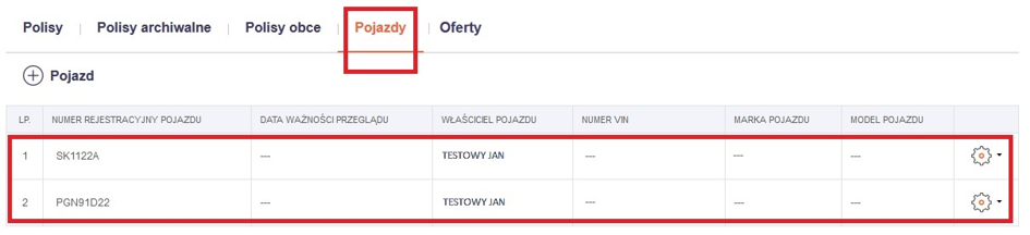 Przypisane Klientowi pojazdy są widoczne w jego kartotece w zakładce POJAZDY: