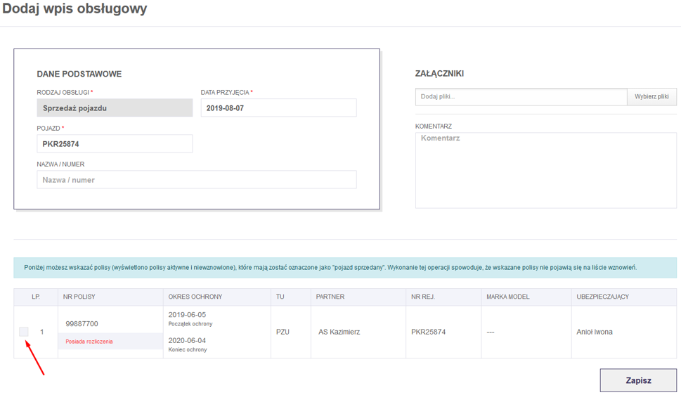 W dolnej części okna zostanie wyświetlona lista polis, na której występuje sprzedany pojazd. Wskazujemy właściwą zaznaczając check-box po lewej stronie wpisu: