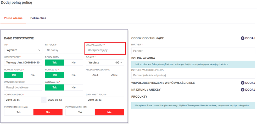 1.1. W formularzu DANE PODSTAWOWE należy wypełnić wszystkie pola obowiązkowe oznaczone gwiazdką. Po wybraniu opcji nowej polisy z poziomu Kartoteki Klienta pola Ubezpieczający i Ubezpieczony zostaną wypełnione automatycznie. Jeżeli przejście do dodawania polisy zostało dokonane z innego miejsca w systemie, pola te należy wypełnić samodzielnie poprzez wyszukanie klienta zapisanego w bazie (wpisując PESEL, NIP lub nazwisko/nazwę firmy) lub utworzenie nowego Klienta. Kliknięcie „+” spowoduje przeniesienie do ekranu dodawania Klienta, a po uzupełnieniu jego danych i wciśnięciu przycisku „Zapisz” zostaniemy przeniesieni ponownie do ekranu dodawania polisy.