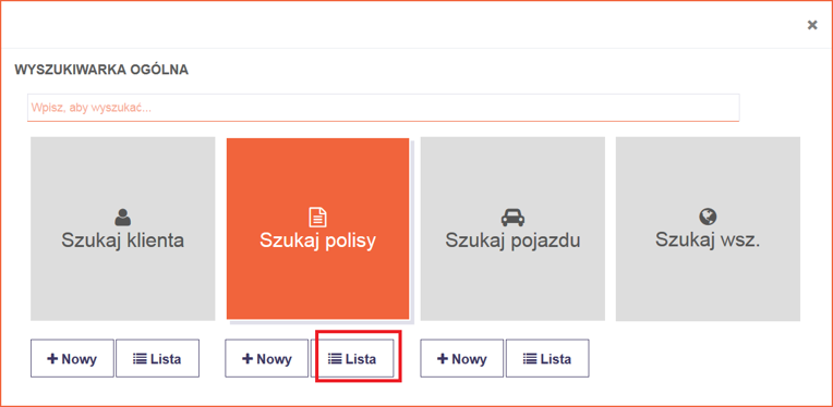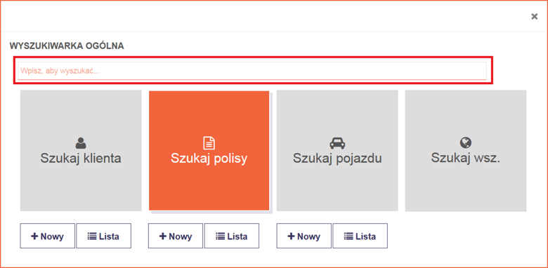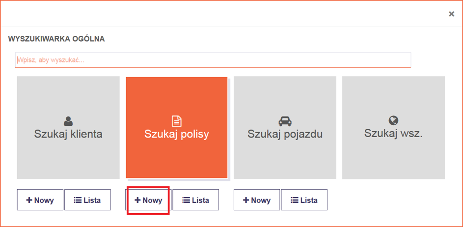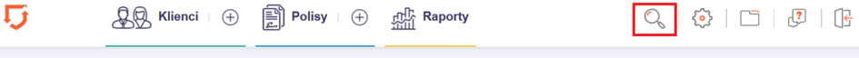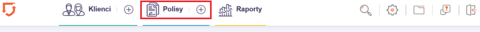 Aby dodać nową polisę należy kliknąć „+” lub skorzystać z górnego menu klikając w „lupę” (menu główne widoczne jest bez względu na to, w jakim module pracujemy)