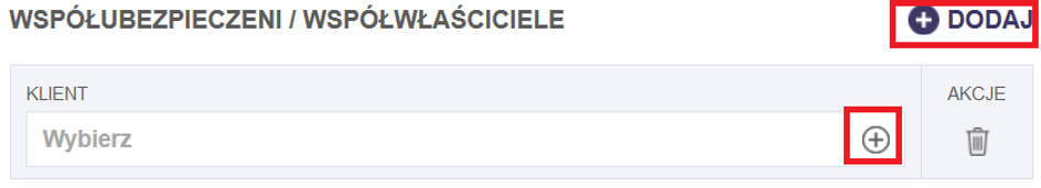 1.5. W następnych sekcjach klikając przycisk + DODAJ można dodać współwłaściciela, wyszukując z bazy danych lub dodając, jeśli jego dane nie były wcześniej wprowadzone: