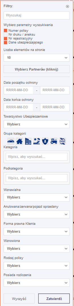 Aby zawęzić kryteria wyszukiwania, albo w przypadku, gdy nie znamy numeru polisy, którą szukamy, można skorzystać z pomocniczych filtrów widocznych w otwartym oknie.