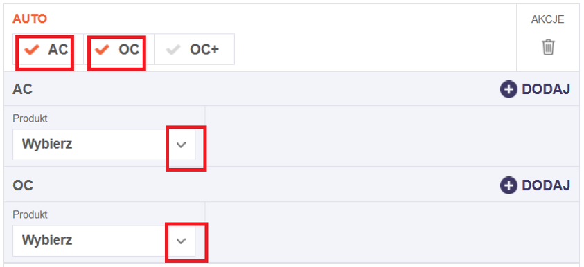 1.7. Po wybraniu kategorii głównej należy wybrać podkategorie produktu zaznaczając checkbox przy wybranej opcji (na przykład przy OC). Wykonanie tej czynności spowoduje możliwość wybrania konkretnego produktu z listy dla każdej z wybranej podkategorii