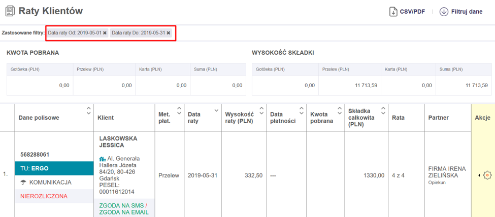 Pojawia nam się lista wszystkich płatności do konkretnych polis. Domyślnie lista jest generowana dla bieżącego miesiąca.