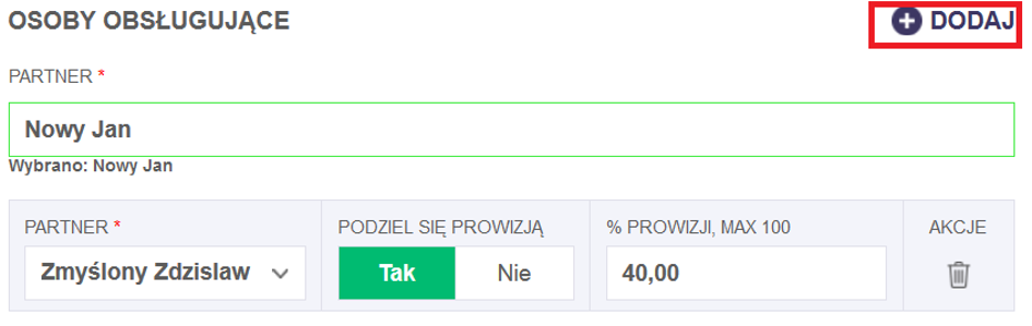 1.3. W sekcji OSOBY OBSŁUGUJĄCE należy wskazać Partnera – opiekuna polisy. Istnieje możliwość dodania dodatkowych osób obsługujących i wskazania ich udziału w prowizji (0-100%). Kliknięcie przycisku zaznaczonego poniżej pozwala na dodanie takiej osoby: