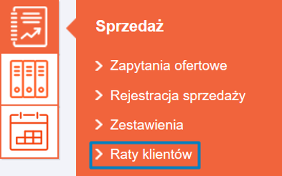 Informacje o tym, czy Klient zapłacił składkę (całą kwotę lub konkretną ratę) znaleźć można w module Raty Klientów. Wchodzimy do niego z menu Sprzedaż: