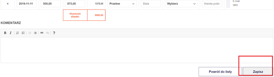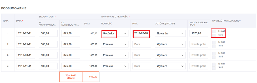 Dodatkowo poniżej pojawi się podsumowanie, w którym można ustalać daty płatności rat, podział kwot produktów na poszczególne raty, czy też informacje o płatności (w przypadku raty gotówkowej można wskazać kto i kiedy przyjął gotówkę). Ponadto można od razu zaznaczyć dla których rat system ma wysyłać przypomnienia o płatności i jaką drogą (e-mail i/lub SMS).