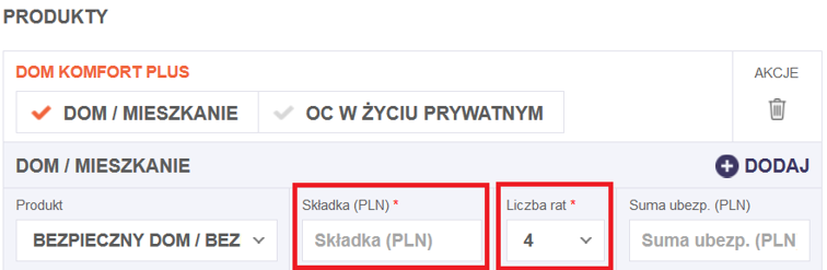 1.8. Po wybraniu produktów z listy należy wpisać wysokość składki produktu i ewentualnie sumę ubezpieczenia, a także sprawdzić ilość rat – poniżej przykład: